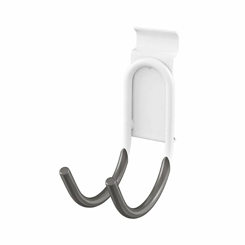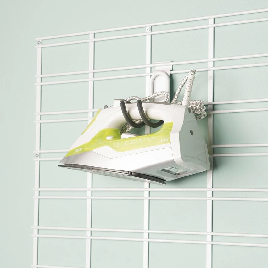 Ce crochet en métal avec revêtement antiglisse se clipse d’un geste sur la grille murale ou sur une crémaillère Walltech. Le système Walltech permet de profiter des murs pour organiser des rangements pratiques et accessibles sans empiéter sur l’espace au sol. Particulièrement adapté au rangement des pièces techniques comme la cuisine, le garage ou la buanderie, Walltech facilite l’organisation de la maison au quotidien. Selon la pièce dans laquelle vous installerez votre espace de rangement Walltech, ce crochet double incurvé vous permettra de suspendre la table à repasser, des outils ou des objets volumineux puisqu’il peut supporter jusqu’à 30 kg.