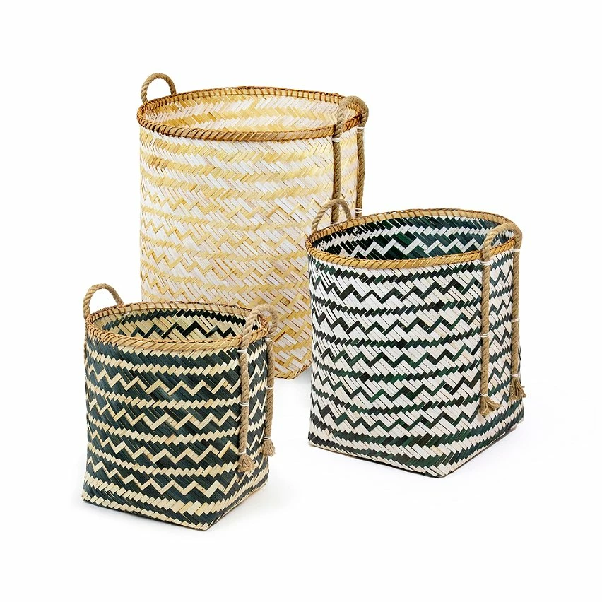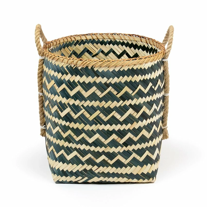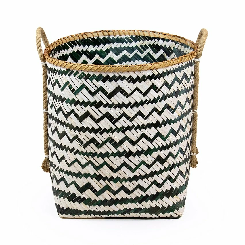 Le tressage décline le même motif géométrique dans 3 coloris différents, joliment assortis : noir et naturel, noir et blanc, naturel et blanc. Chaque panier est unique. Les légères variations de couleur et de forme sont une caractéristique de la fibre naturelle et confèrent à ces paniers toute leur authenticité. Dimensions : Diamètre 50 X H.61 cm/Diamètre 44 X H.53 cm/Diamètre 35 X H.44 cm.