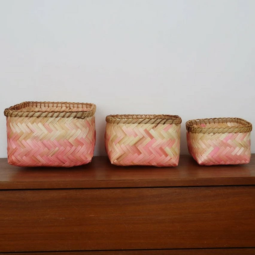 - Panier de rangement en bambou naturel et rose à effet tie and dye