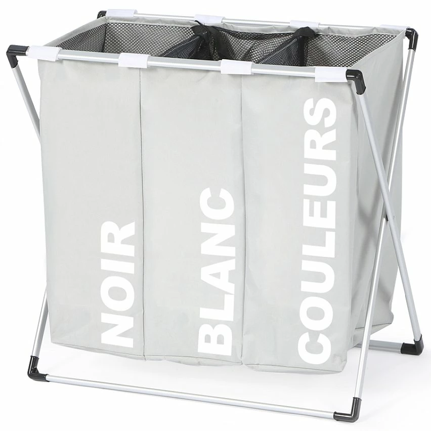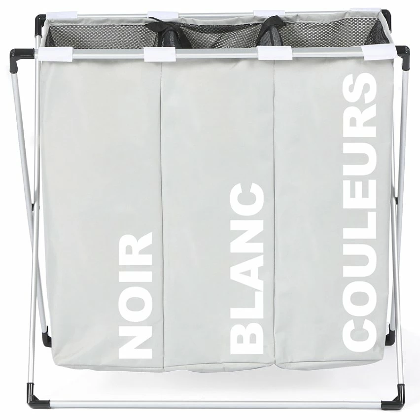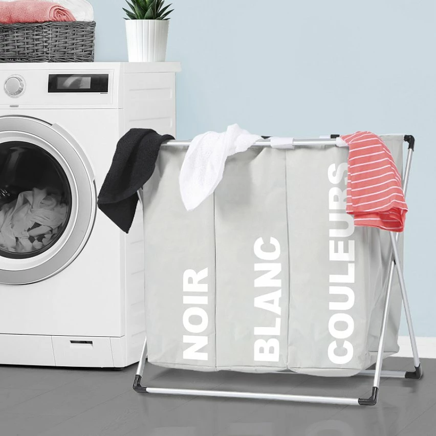 Descriptif du panier à linge 3 compartiments Esthétique, avec sa jolie couleur gris perle discrète, et ses inscriptions modernes blanches, elle s’intégrera parfaitement dans votre salle de bains, chambre ou buanderie.Ses dimensions compactes en font un accessoire peu encombrant qui vous fera gagner de l’espace. Fini le linge sale qui traîne, la chaussette oubliée !Suivez les inscriptions pour pratiquer un tri par couleur, par type de linge ou par membre de la famille, comme bon vous semble, selon vos besoins et quantité de linge.La structure en aluminium du coffre à linge triple lui assure stabilité et solidité une fois le sac en tissu souple rempli.Des connecteurs plastique permettent au panier à linge de se replier sur lui même lorsque vous souhaitez le ranger pour libérer de l’espace une fois les machines terminées, ou le transporter pour libérer de l’espace. 2 sangles ultra pratiques et résistantes facilitent le transport de ce bac à linge léger.Fermez les différents sacs grâce à des filets à fermeture par cordon faisant office de couvercle une fois le linge de votre lavage prêt, leur système d’aération évitera les mauvaises odeurs et l’humidité.La lessive ne sera plus une corvée mais un plaisir, vous n’aurez plus à trier le linge une fois le moment du lavage venu ! Chaque membre de la famille peut ranger le linge sale au fur et à mesure dans le bac prévu à cet effet, et vous faire gagner du temps, ingénieux!Et idéal pour sensibiliser votre enfant ou ado aux tâches ménagères quotidiennes et installer des automatismes !Gardez votre maison propre et bien rangée avec le bac à linge triple ludique !Dimensions du panier à linge 3 compartimentsDimensions globales hors-tout : Longueur 60 x largeur 36 x Hauteur 58 cmDimensions d’un compartiment : Longueur 19 x largeur 30 x Hauteur 53 cm